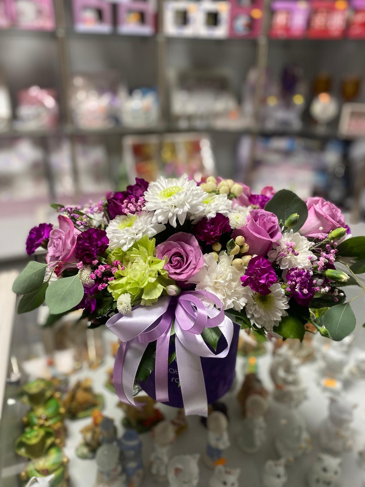 Maiga kompozīcija lillā kastē ar zaļumiem, rozēm, krizantēmām un neļķēm.