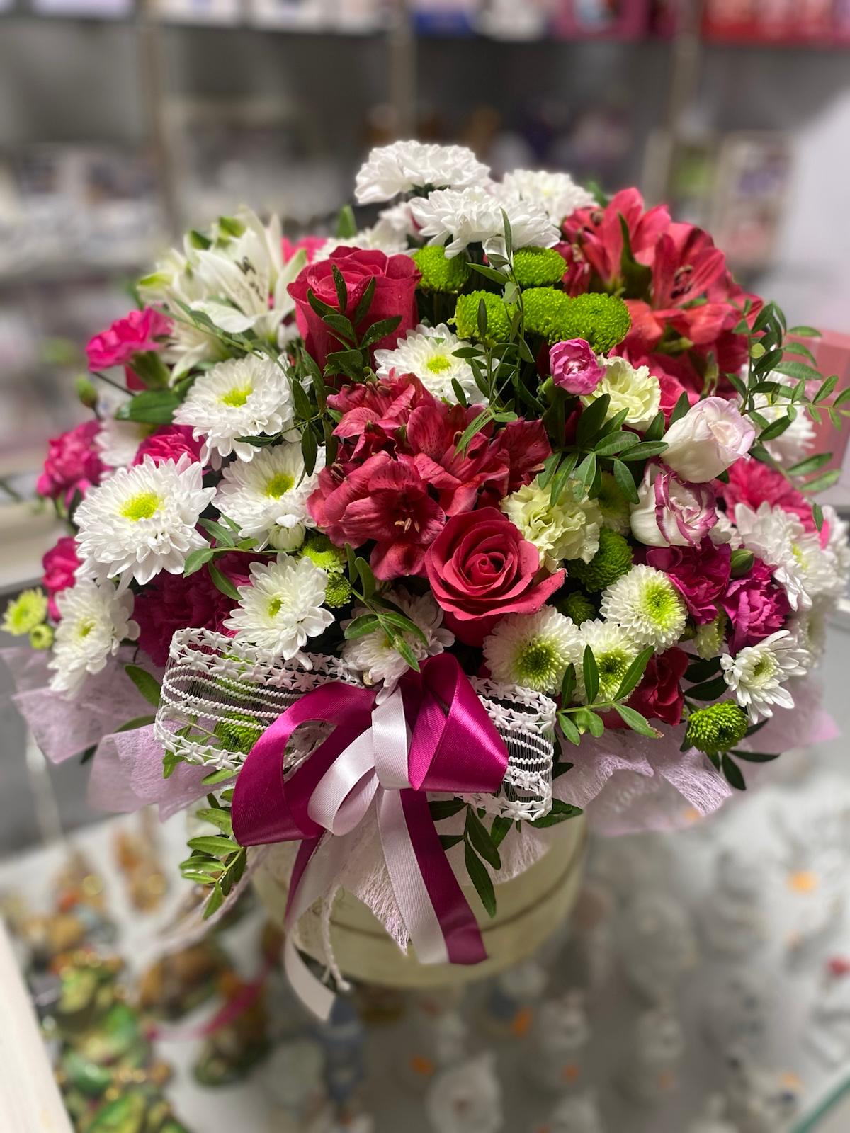 Koša kompozīcija kastītē, kur apvienoti dažādi ziedi skaistā kombinācijā.