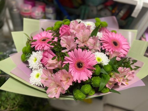 Pušķī ir gerberas, alstromerijas un krizantēmas.
